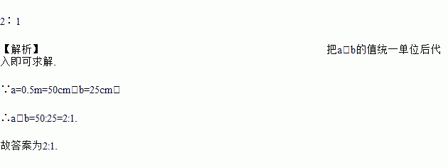 已知a=0.5 m,b=25 cm,则a∶b=________.