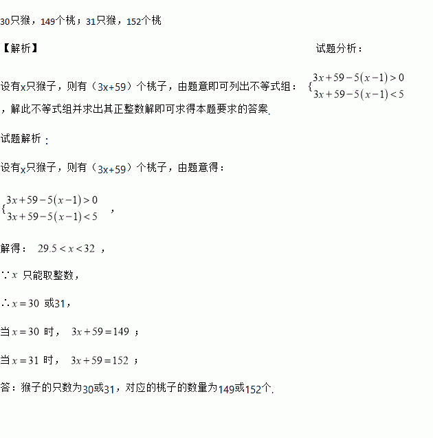 一群猴子结伴去偷桃,在分桃时;如果每只猴子分3个,那么还剩59个;如果每只猴子分5个,那么有一只猴子分得的桃不足5个,你能求出有多少只猴子,多少个桃吗?