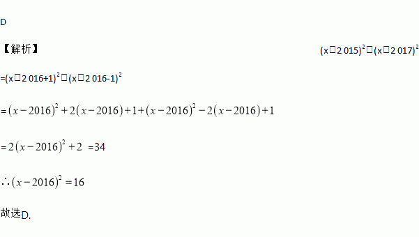 已知(x-2 015)2+(x-2 017)2=34,则(x-2 016)2的值是( )