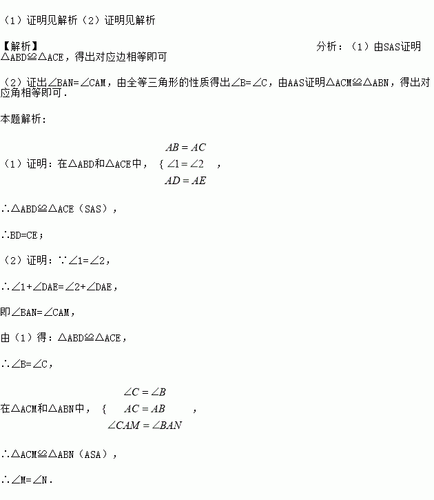 已知△ABN和△ACM位置如图所示,AB=AC,AD=AE,∠1=∠2.