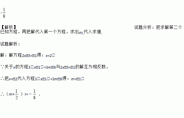 已知关于x的方程3(x﹣1)=3m﹣6与2x﹣5=﹣1的解互为相反数,求(m+)3的值.