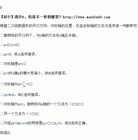 C. 2a﹣b=0 D. 方程ax2+bx+c=0的两根是x1=﹣1,x2=3