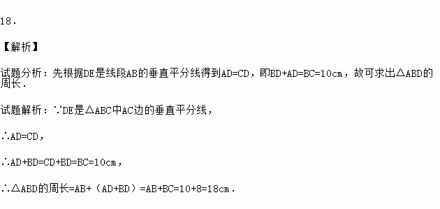 如图,DE是△ABC中AC边的垂直平分线,若AB=8cm,BC=10cm,则△ABD的周长为 cm.