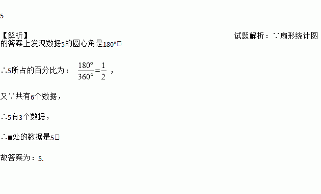 在整理数据5、5、3、█、2、4时,█处的数据看不清,但从扇形统计图的答案上发现数据5的圆心角是180度,则█处的数据是__________.