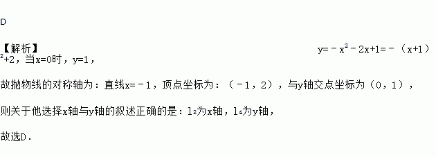 D 【解析】y=﹣x2﹣2x+1=﹣(x+1)2+2,当x=0时,y=1, 故抛物线的对称轴为:直线x=﹣1,顶点坐标为:(﹣1,2),与y轴交点坐标为(0,1), 则关于他选择x轴与y轴的叙述正确的是:l2为x轴,l4为y轴, 故选D.