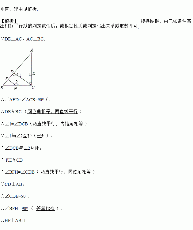 如图,已知AC⊥BC,CD⊥AB,DE⊥AC,∠1与∠2互补,判断HF与AB是否垂直,并说明理由(填空)