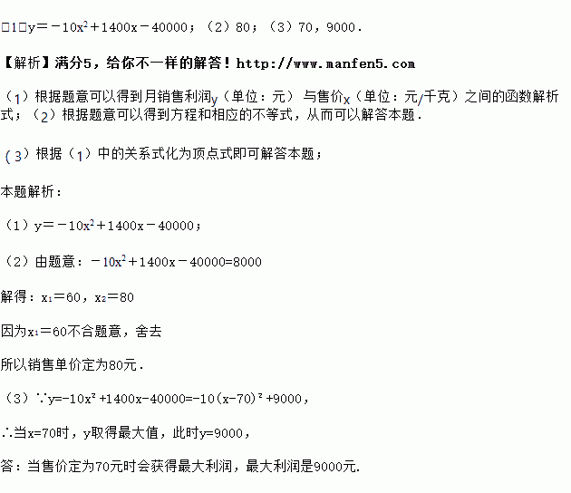 (1)写出月销售利润y(单位:元)与售价x(单位:元/千克)之间的函数解析式.