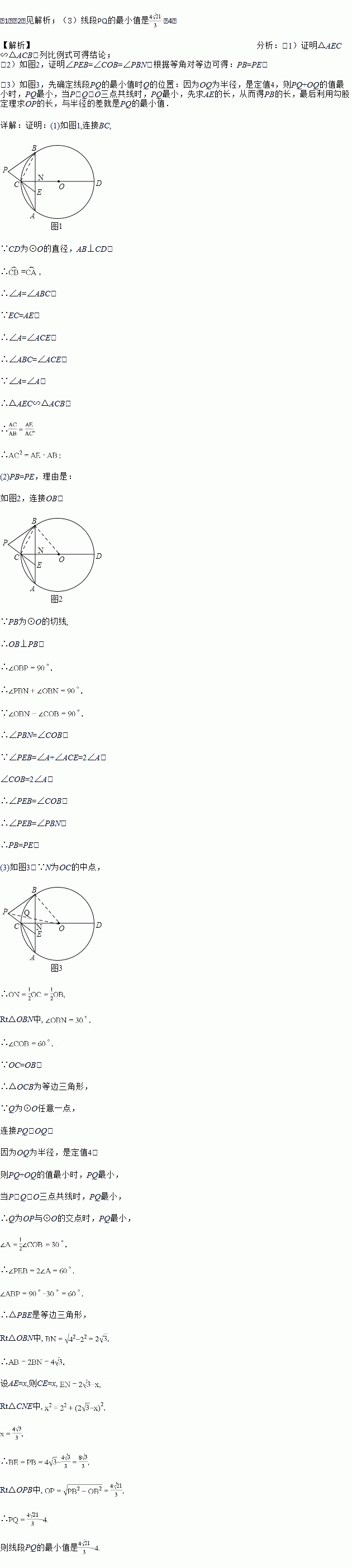 (3)设⊙O的半径为4,N为OC的中点,点Q在⊙O上,求线段PQ的最小值.