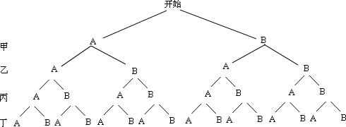 某校十分重视学生的用眼卫生,并定期进行视力检测.某次检测设有A、B两处检测点,4名学生各自随机选择其中的一处检测视力.请用画树状图的方法列出所有可能的结果,并求4名学生中至少有3人在同一处检测视力的概率.