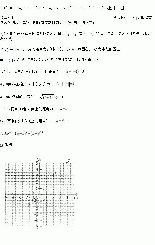 (1)点C(4,5);(2)3,4,5;(a-c)+(b-d)(3)见图中:圆. 【解析】试题分析:(1)根据有序数对的含义解答,明确有序数对前后两个数表示的含义; (2)根据两点在坐标轴方向的距离含义或解答;两点间的距离则根据勾股定理解答. (3)与(0,0)点的距离为1的点在以(0,0)为圆心,以1为半径的圆上. 【解析】 (1)点B的位置如图,点C的位置用数对(4,...