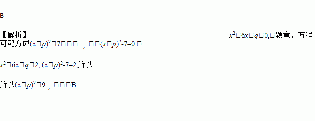 B 【解析】x2-6x+q=0,由题意,方程可配方成(x-p)2=7的形式 ,所以(x-p)2-7=0,由 x2-6x+q=2, (x-p)2-7=2,所以 所以(x-p)2=9,所以选B.