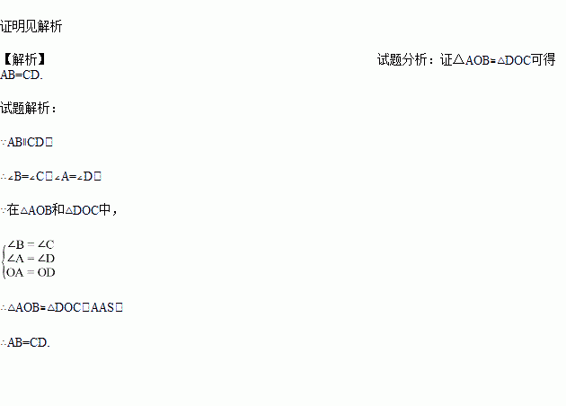 已知:如图,AD,BC相交于点O,OA=OD,AB∥CD。求证:AB=CD。