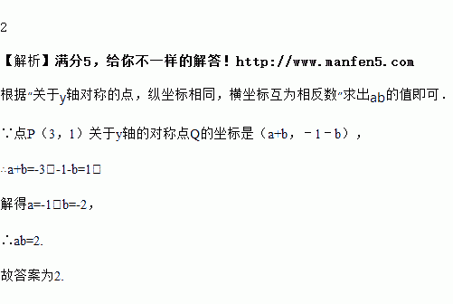 已知点P(3,1)关于y轴的对称点Q的坐标是(a+b,﹣1﹣b),则ab的值为_____.