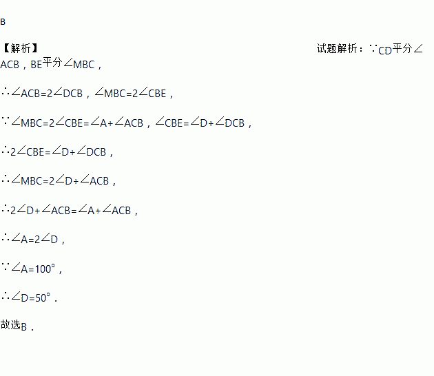 如图,∠MAN=100°,点B,C是射线AM,AN上的动点,∠ACB的平分线和∠MBC的平分线所在直线相交于点D,则∠BDC的大小为( )