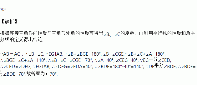 如图,在△ABC中,AB=AC,D、E分别为AB、AC上的点,∠BDE、∠CED的平分线分别交BC于点F、G,EG∥AB.若∠BGE=110°,则∠BDF的度数为___________