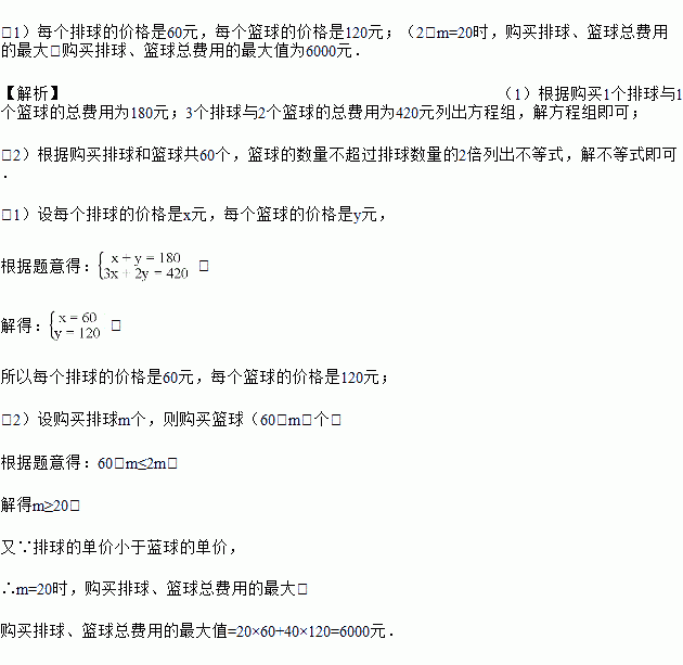 (2)若该学校计划购买此类排球和篮球共60个,并且篮球的数量不超过排球数量的2倍.求至少需要购买多少个排球?并求出购买排球、篮球总费用的最大值?