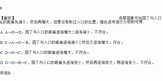 中点,园丁在苗圃圆周或两条交叉过道上匀速行进.设该园丁行进的时间为x,与入口K的距离为y,表示y与x的函数关系的图象大致如图2所示,则该园丁行进的路线可能是( )