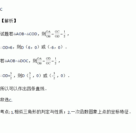 在直角坐标系中,已知点A(-2,0)、B(0,4)、C(0,3),过点C作直线交x轴于点D,使得以D、O、C为顶点的三角形与△AOB相似,这样的直线最多可以作( )