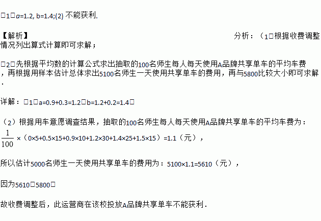 (2)已知该校有5100名师生,且A品牌共享单车投放该校一天的费用为5800元。试估计:收费调整后,此运营商在该校投放A品牌共享单车能否获利?说明理由。