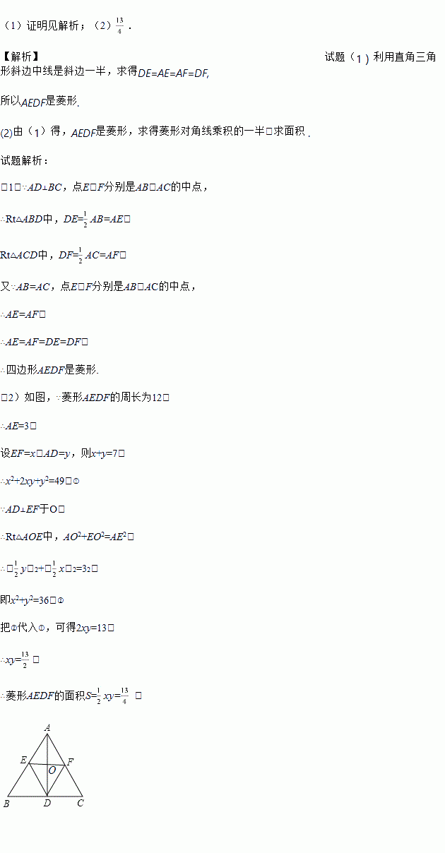 (2)如果四边形AEDF的周长为12,两条对角线的和等于7,求四边形AEDF的面积S.