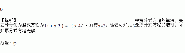 D 【解析】根据分式方程的解法,先去分母化为整式方程为1+(x-3)=-(x-4),解得x=3,检验可知x=3是原分式方程的增根,可知原分式方程无解. 故选:D.