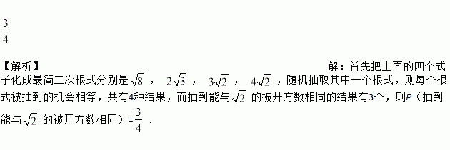 从, , , 中随机抽取一个二次根式,化简后和的被开方数相同的概率是________.