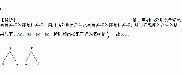 一天晚上,小丽在清洗两只颜色分别是粉色和白色的有盖茶杯时,突然停电了,小丽只好将杯盖和茶杯随机地搭配在一起,则其颜色搭配一致的概率是( )