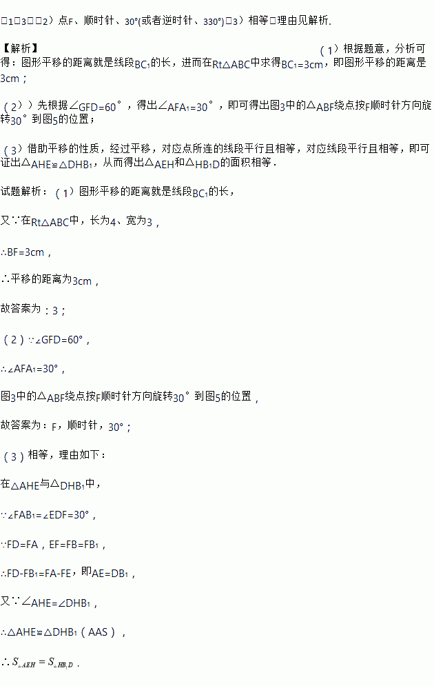 (2)在图5中若∠GFD=60°,则图3中的△ABF绕点 按 方向旋转 到图5的位置;