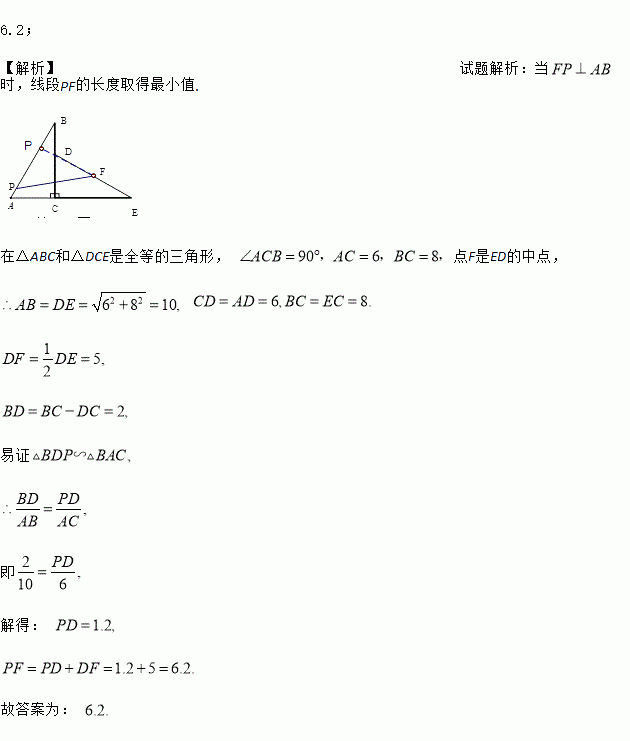 如图:在△ABC和△DCE是全等的三角形,∠ACB=90°,AC=6,BC=8,点F是ED的中点,点P是线段AB上动点,则线段PF最小时的长度________________.