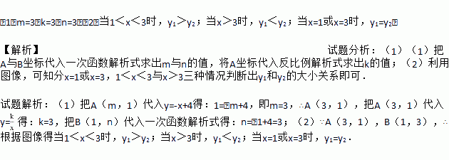 如图,函数y1=﹣x+4的图象与函数(x>0)的图象交于A(m,1),B(1,n)两点.