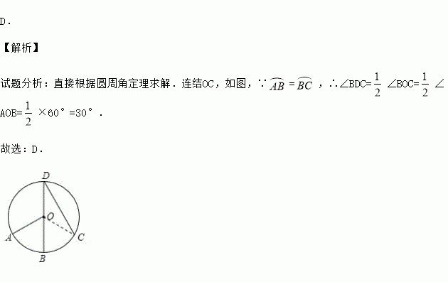 D. 【解析】 试题分析:直接根据圆周角定理求解.连结OC,如图,∵=,∴∠BDC=∠BOC=∠AOB=×60°=30°. 故选:D.