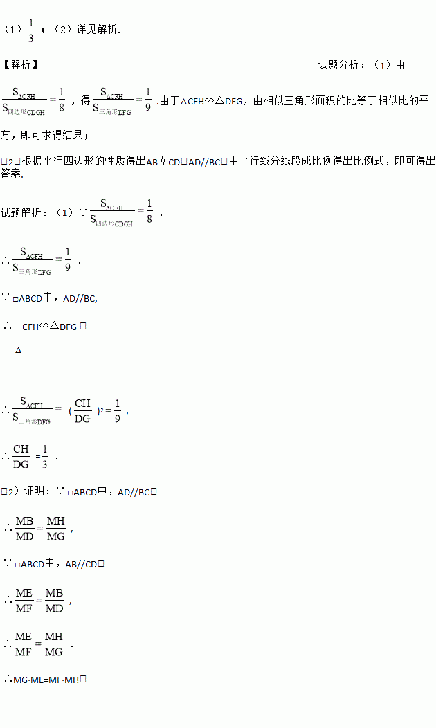 (1);(2)详见解析. 【解析】试题分析:(1)由,得.由于△CFH∽△DFG,由相似三角形面积的比等于相似比的平方,即可求得结果; (2)根据平行四边形的性质得出AB∥CD,AD//BC,由平行线分线段成比例得出比例式,即可得出答案. 试题解析:(1)∵, ∴. ∵ □ABCD中,AD//BC, ∴ △CFH∽△DFG , ∴ ()2, ∴=. ...