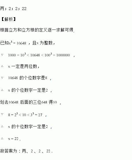 据说,我国著名数学家华罗庚在一次出国访问途中,看到飞机上邻座的乘客阅读的杂志上有一道智力题:求59319的立方根,华罗庚脱口而出:你知道他是怎么快速准确地计算出来的吗?请研究解决下列问题:![]()