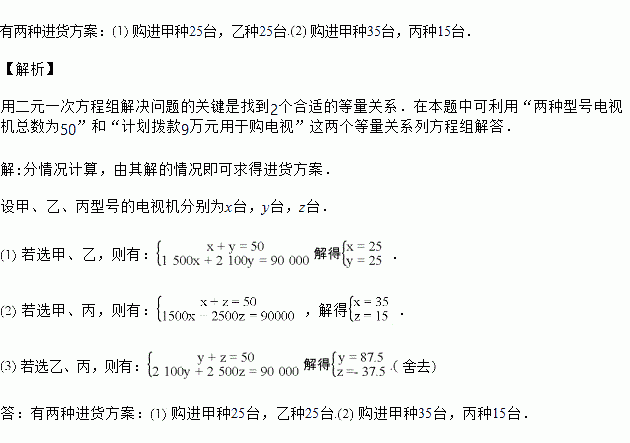 某商场计划拨款9万元从厂家购进50台电视机,已知该厂家生产三种不同型号的电视机,出厂价分别为:甲种每台1 500元,乙种每台2 100元,丙种每台2 500元,若商场同时购进其中两种不同型号电视机共50台,用去9万元,请你研究一下商场的进货方案.