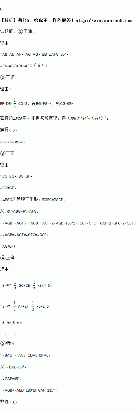 ①△ABG≌△AFG;②BG=CG;③AG∥CF;④S△EGC=S△AFE;⑤∠AGB+∠AED=145°.