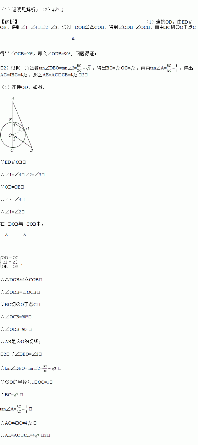 如图,CE是⊙O的直径,BC切⊙O于点C,连接OB,作ED∥OB交⊙O于点D,BD的延长线与CE的延长线交于点A.