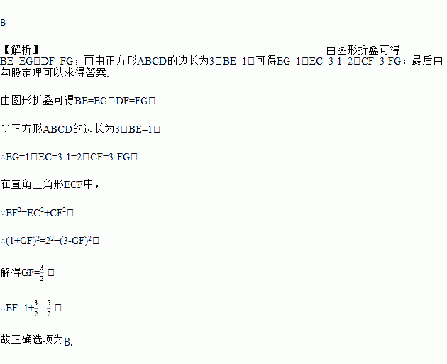 如图,正方形ABCD的边长为3,点E、F分别在边BC、CD上,将AB、AD分别沿AE、AF折叠,点B、D恰好都落在点G处,已知BE=1,则EF的长为( )