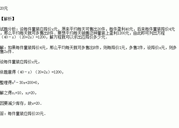 黄冈百货商店服装柜在销售中发现:“宝乐”牌童装平均每天可售出20件,每件盈利40元.为了迎接“六•一”国际儿童节,商场决定采取适当的降价措施,扩大销售量,增加盈利,尽量减少库存.经市场调查发现:如果每件童装降价4元,那么平均每天就可多售出8件.要想平均每天销售这种童装上盈利1200元,那么每件童装应降价多少元?