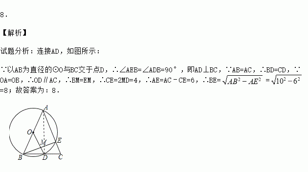 如图,在△ABC中,AB=AC=10,以AB为直径的⊙O与BC交于点D,与AC交于点E,连OD交BE于点M,且MD=2,则BE长为 .