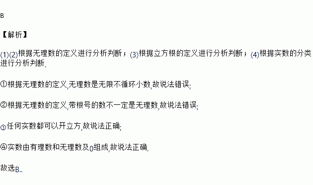 下列说法:(1)无限小数是无理数;(2)无理数都是带根号的数;(3)任何实数都可以开立方;(4)有理数都是实数.其中正确的个数是( )