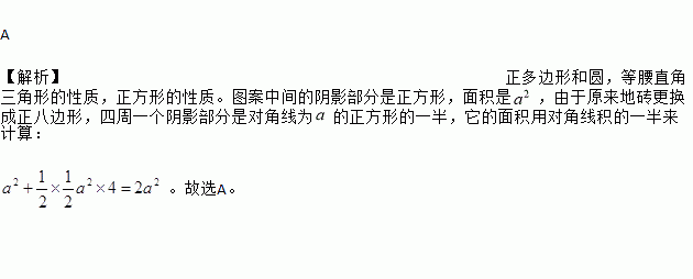 A 【解析】正多边形和圆,等腰直角三角形的性质,正方形的性质。图案中间的阴影部分是正方形,面积是,由于原来地砖更换成正八边形,四周一个阴影部分是对角线为的正方形的一半,它的面积用对角线积的一半来计算: 。故选A。