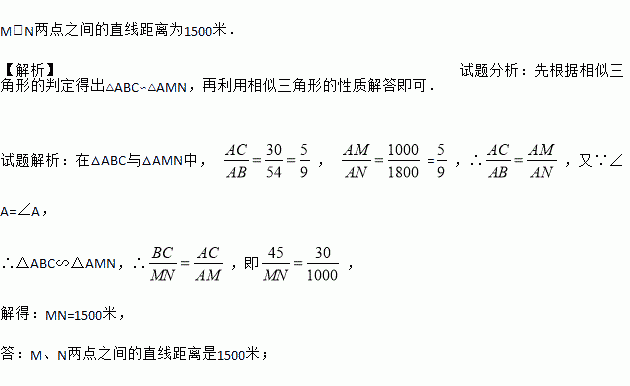 如图,M,N为山两侧的两个村庄,为了两村交通方便,根据国家的惠民政策,政府决定打一直线涵洞,工程人员为计算工程量,必须测量M、N两点之间的直线距离.选择测量点A、B、C,点B、C分别在AM、AN上,现测得AM=1千米,AN=1.8千米,AB=54米,BC=45米,AC=30米,求M、N两点之间的直线距离.