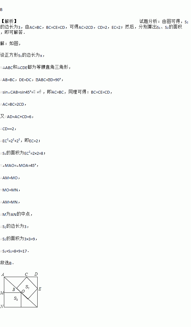 如图,边长为6的大正方形中有两个小正方形,若两个小正方形的面积分别为S1、S2 , 则S1+S2的值为( )