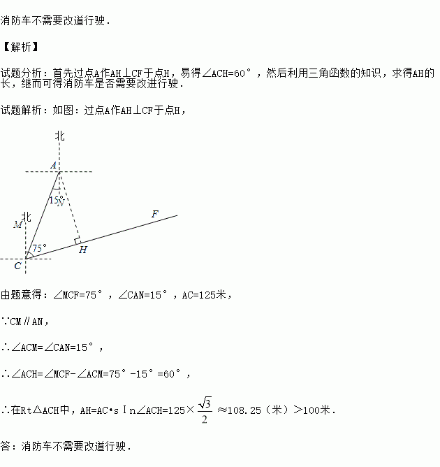 ¸ß¿¼Ó¢ÓïÌýÁ¦²âÊÔÆÚ¼ä£¬ÐèÒª¶Å¾ø¿¼µãÖÜΧµÄÔëÒô£¬Èçͼ£¬µãAÊÇijÊÐÒ»¸ß¿¼¿¼µã£¬ÔÚλÓÚA¿¼µãÄÏÆ«Î÷15¡ã·½Ïò¾àÀë125Ã×µÄCµã´¦ÓÐÒ»Ïû·À¶Ó£®ÔÚÌýÁ¦¿¼ÊÔÆÚ¼ä£¬Ïû·À¶ÓͻȻ½Óµ½±¨¾¯µç»°£¬¸æÖªÔÚλÓÚCµã±±Æ«¶«75¡ã·½ÏòµÄFµãÍ»·¢»ðÔÖ£¬Ïû·À¶Ó±ØÐëÁ¢¼´¸ÏÍù¾È»ð£¬ÒÑÖªÏû·À³µµÄ¾¯±¨Éù´«²¥°ë¾¶Îª100Ã×£¬ÈôÏû·À³µµÄ¾¯±¨Éù¶ÔÌýÁ¦²âÊÔÔì³ÉÓ°Ï죬ÔòÏû·À³µ±ØÐë¸ÄµÀÐÐÊ»£®ÊÔÎÊ£ºÏû·À³µÊÇ·ñÐèÒª¸ÄµÀÐÐÊ»£¿ËµÃ÷ÀíÓÉ£®£¨