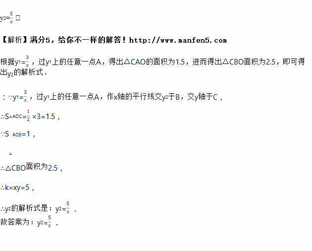 双曲线y1,y2在第一象限的图象如图,y1=,过y1上的任意一点A,作x轴的平行线交y2于B,交y轴与C,若△AOB的面积为1,则y2的解析式是_____.