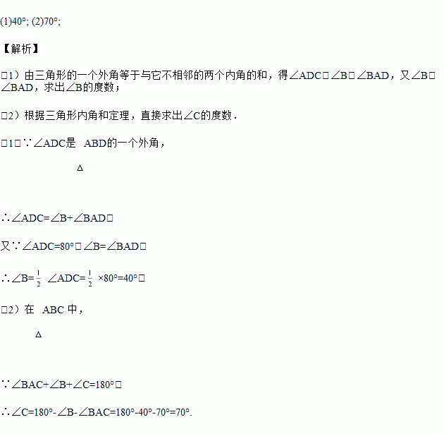 如图,D是△ABC的边BC上一点,∠B=∠BAD,∠ADC=80°,∠BAC=70°.