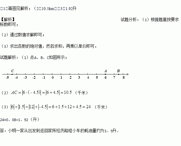 (3)若小轿车每千米耗油0.08升,求小明一家从出发到返回家所经历路程小车的耗油量。