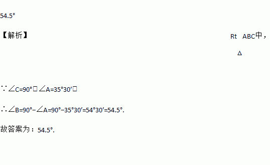 54.5° 【解析】Rt△ABC中, ∵∠C=90°,∠A=35°30′, ∴∠B=90°?∠A=90°?35°30′=54°30′=54.5°. 故答案为:54.5°.