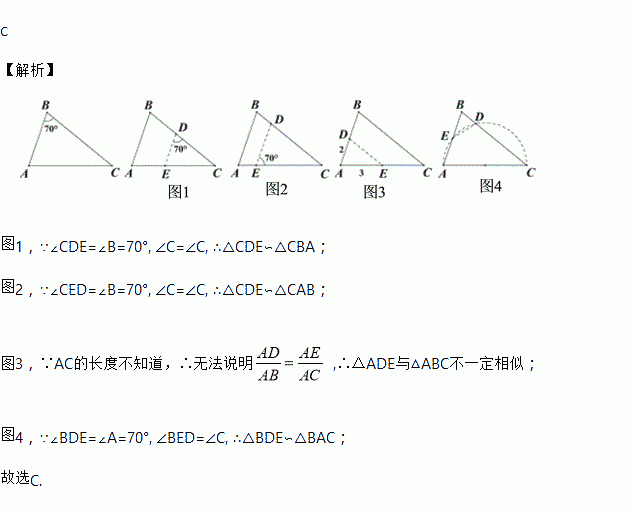 C 【解析】 图1,∵∠CDE=∠B=70°, ∠C=∠C, ∴△CDE∽△CBA; 图2,∵∠CED=∠B=70°, ∠C=∠C, ∴△CDE∽△CAB; 图3,∵AC的长度不知道,∴无法说明 ,∴△ADE与△ABC不一定相似; 图4,∵∠BDE=∠A=70°, ∠BED=∠C, ∴△BDE∽△BAC; 故选C.