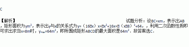 如图,假设篱笆(虚线部分)的长度为16 m,则所围成矩形ABCD的最大面积是( )